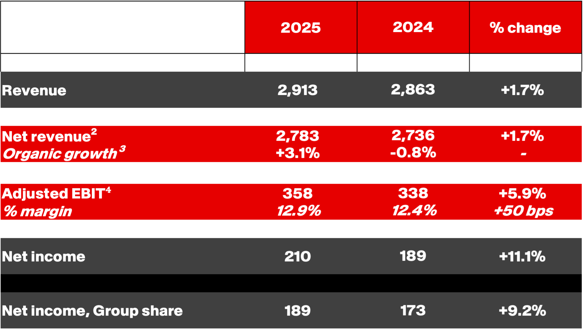 - Net revenue rose by 3.1% on an organic basis7 (compared to -0.8% one year earlier). Accordingly, organic growth for 2025 came in slightly above the top of the guidance range, +2.5% to +3.0%.
