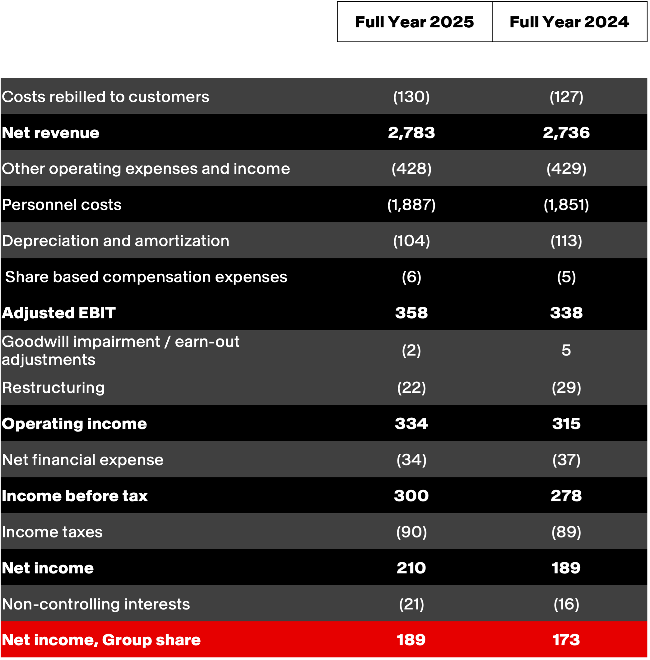 Net income attributable to non-controlling interests increased to 21 million euros for full year 2025, compared to 16 million in 2024, reflecting improved performances from recent acquisitions.
