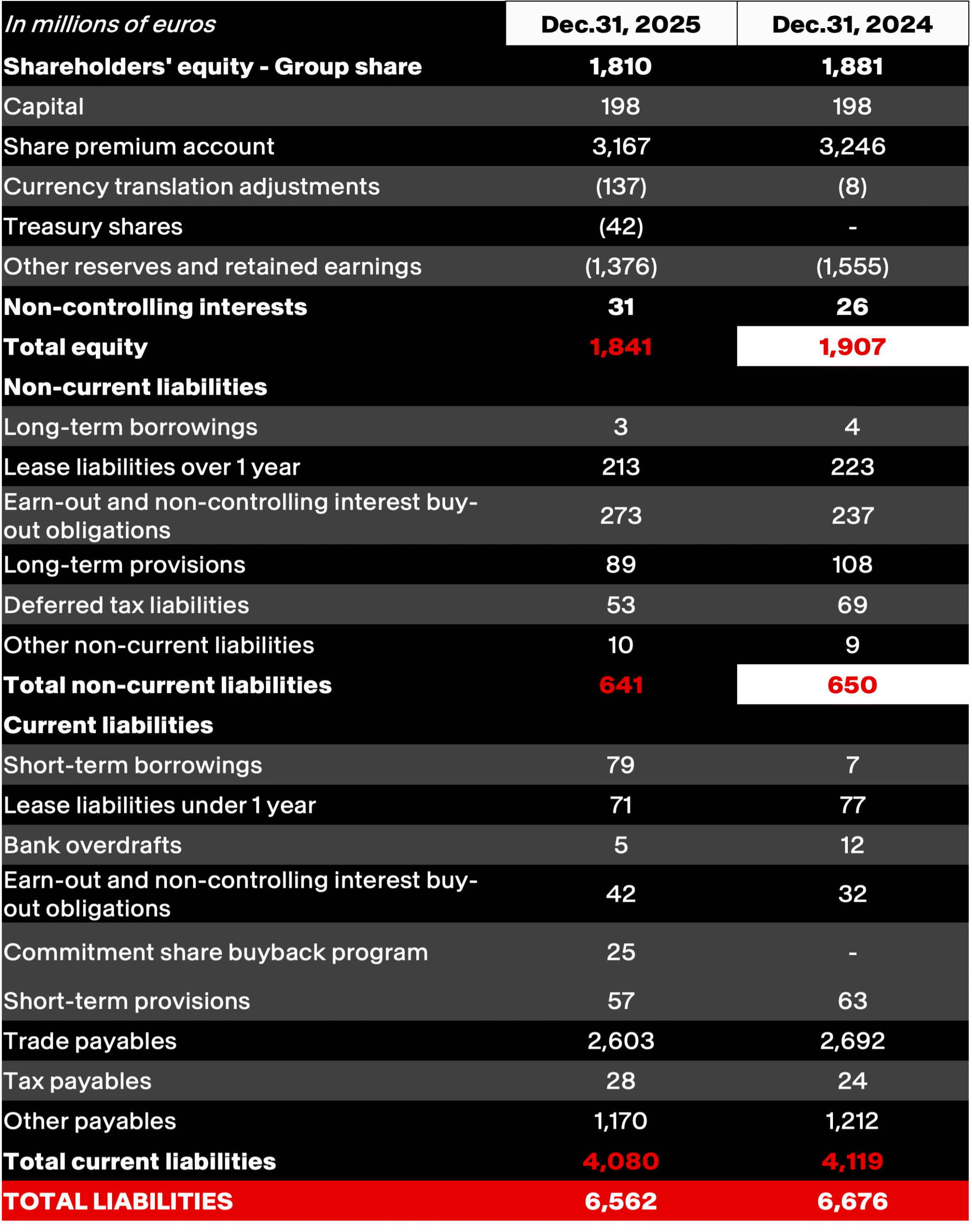 Consolidated equity stood at 1,841 million euros at the end of December 2025, compared to 1,907 million euros at the end of December 2024.